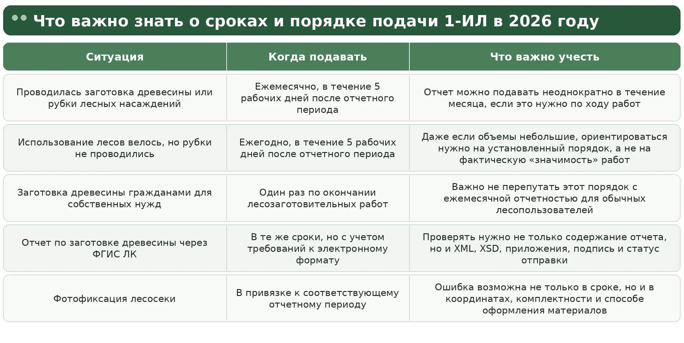 Если были рубки или заготовка древесины, отчет подается ежемесячно в течение 5 рабочих дней после отчетного периода. Если рубок не было, действует ежегодная подача в течение 5 рабочих дней после окончания отчетного периода. Это один из самых важных нюансов 2026 года