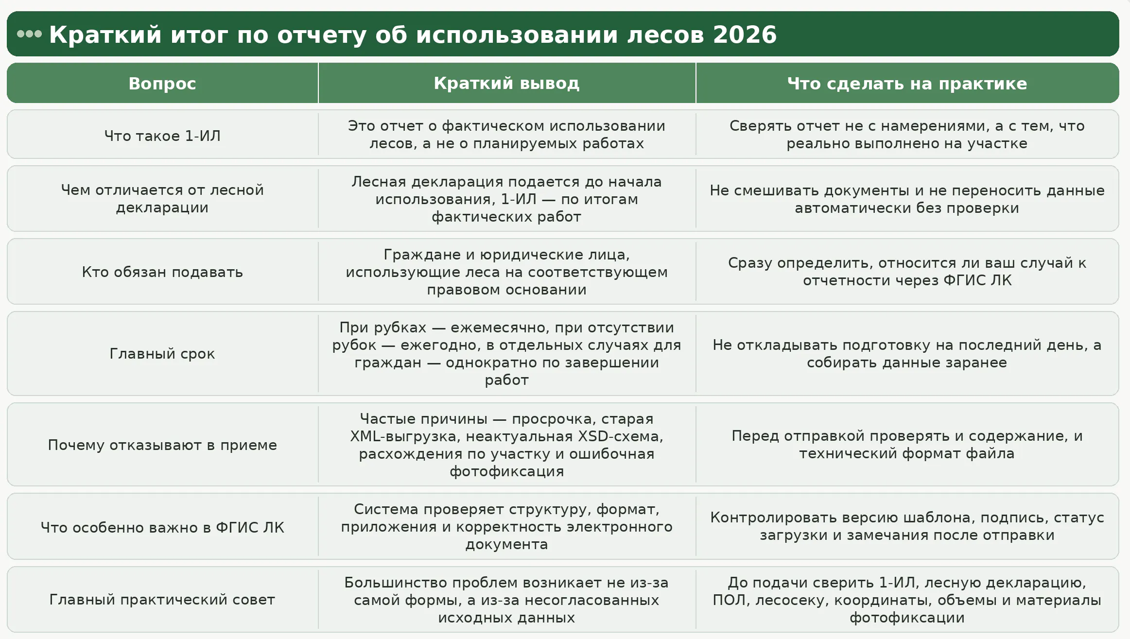Важно заранее определить, кто отвечает за исходные данные: собственный специалист, лесной отдел, геодезист, подрядчик или внешний исполнитель. На практике большинство проблем возникает не из-за самой формы 1-ИЛ, а из-за несогласованности документов, геоданных, сроков и технических файлов.